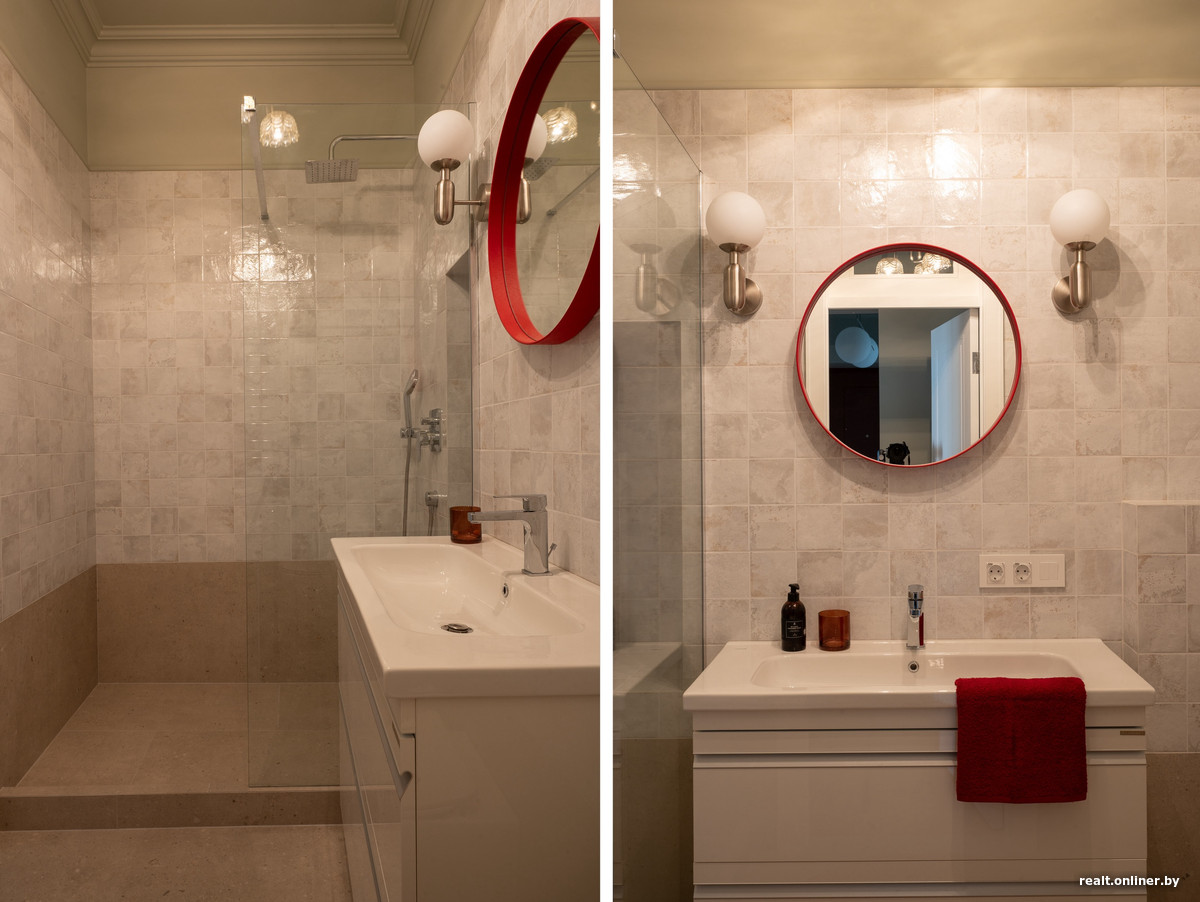 В санузле разместили просторную душевую кабину. Внутри нее предусмотрели нишу для шампуней и косметики: она была заложена конструктивно еще в старой планировке, но ее немного уменьшили, чтобы сделать пропорции более аккуратными и гармоничными. А чтобы не перегружать помещение, стиральную машину вынесли в коридор.