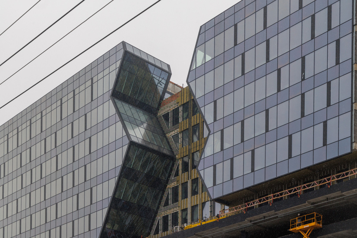 Торговый центр с ломаными фасадами скоро откроется возле завершенного жилого комплекса «Маэстро». Эти два объекта создали полноценный футуристичный ансамбль, визуально будто дополняют друг друга, хоть и принадлежат разным застройщикам. И тут самое время вспомнить, что еще каких-то 9 лет назад эта локация с вайбом мегаполиса выглядела совсем по-другому. На месте ТЦ была песчаная площадка, а на месте высоток — знаменитые бараки.