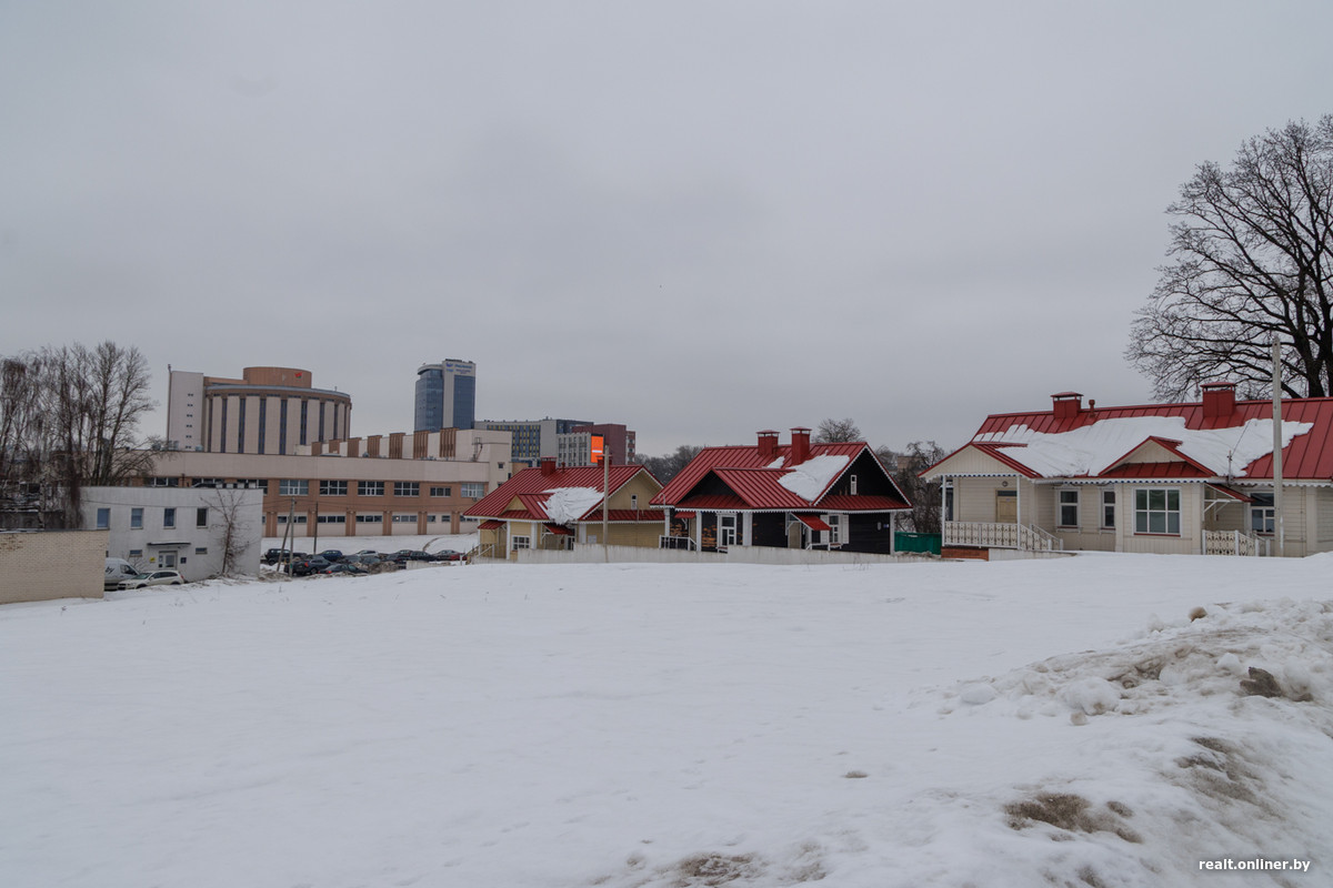 Деревянные дома напротив музтеатра были построены в 1939 и 1953 году. Еще в середине прошлого десятилетия в них жили люди, но к 2017 году их отселили, а сами деревянные постройки начали разбирать.