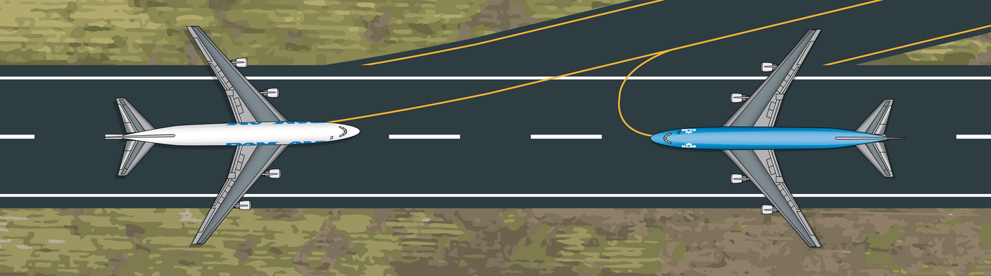 Чтобы понять, что произошло далее, необходимо взглянуть на схему аэропорта. Даже человек, не разбирающийся в авиации, обратит внимание, что тот самый третий съезд был направлен против хода Clipper Victor. Чтобы выполнить требование диспетчеров, американцу потребовалось бы осуществить поворот на 148 градусов, а затем еще один, ровно такой же, перед магистральной рулежной дорожкой. Экипаж Pan Am решил, что это физически невозможно, учитывая габариты их самолета, тем более что следующий, четвертый съезд был гораздо удобнее: там их ждало два поворота всего лишь на 35 градусов. Сделав вывод об ошибке диспетчеров, американский Boeing проехал третий съезд и продолжил движение к четвертому. Он не доехал до того самую малость.