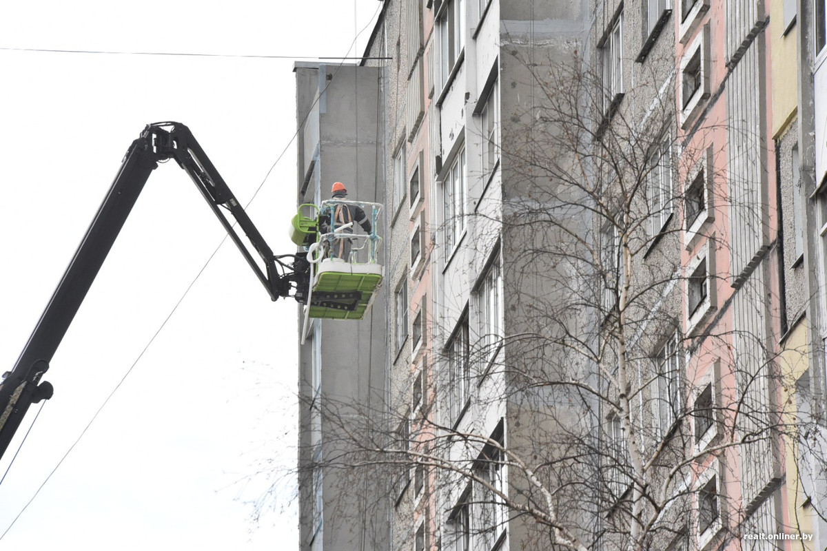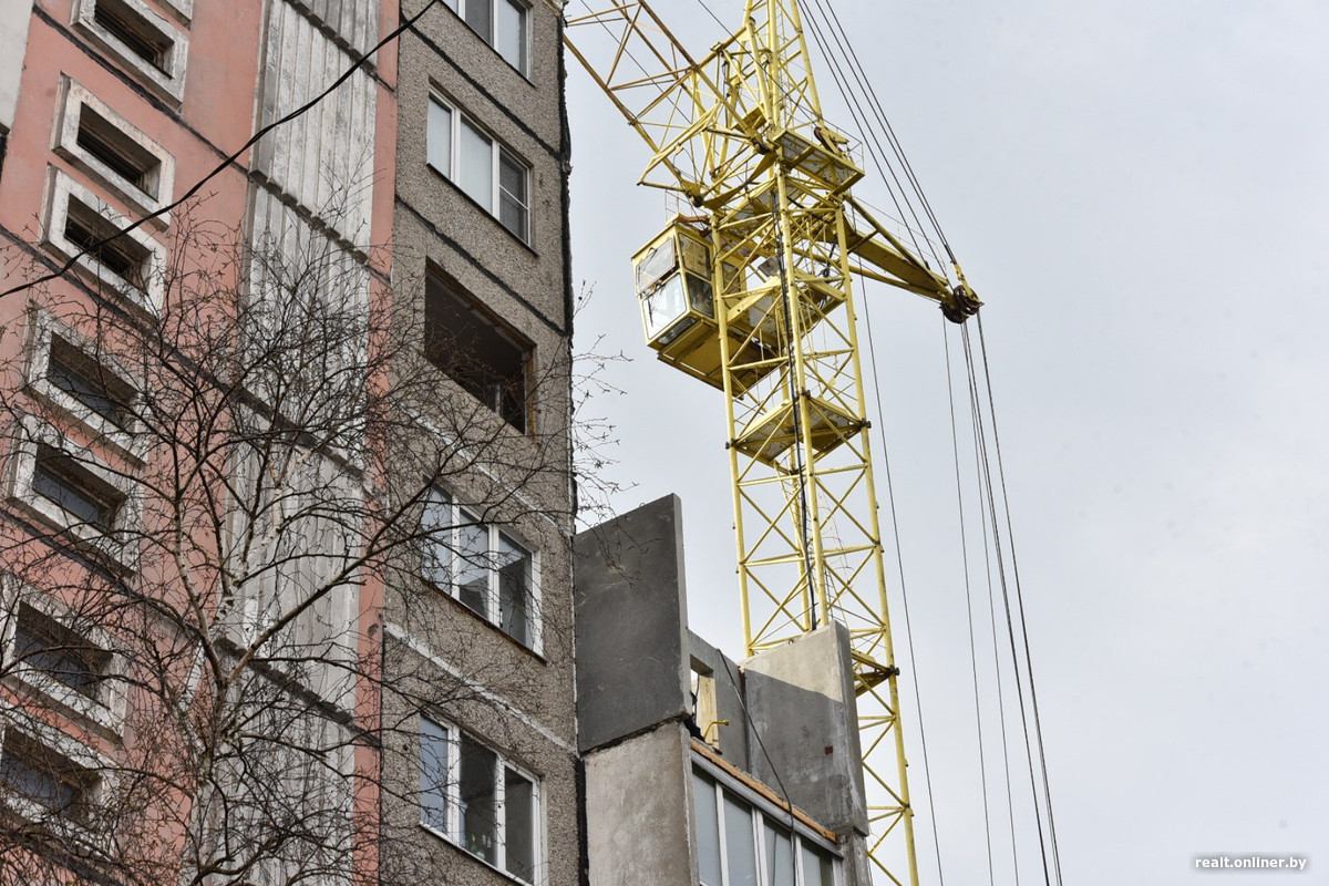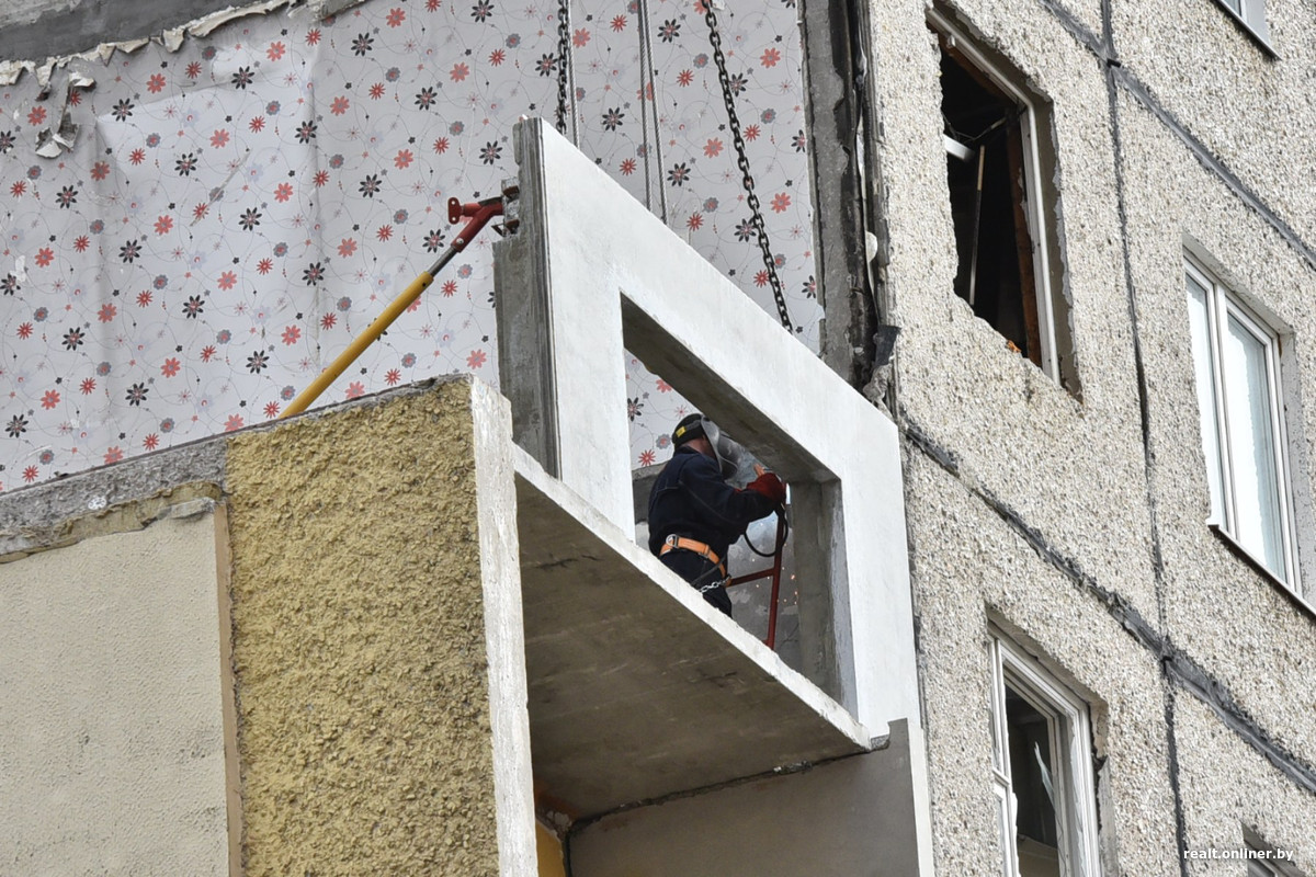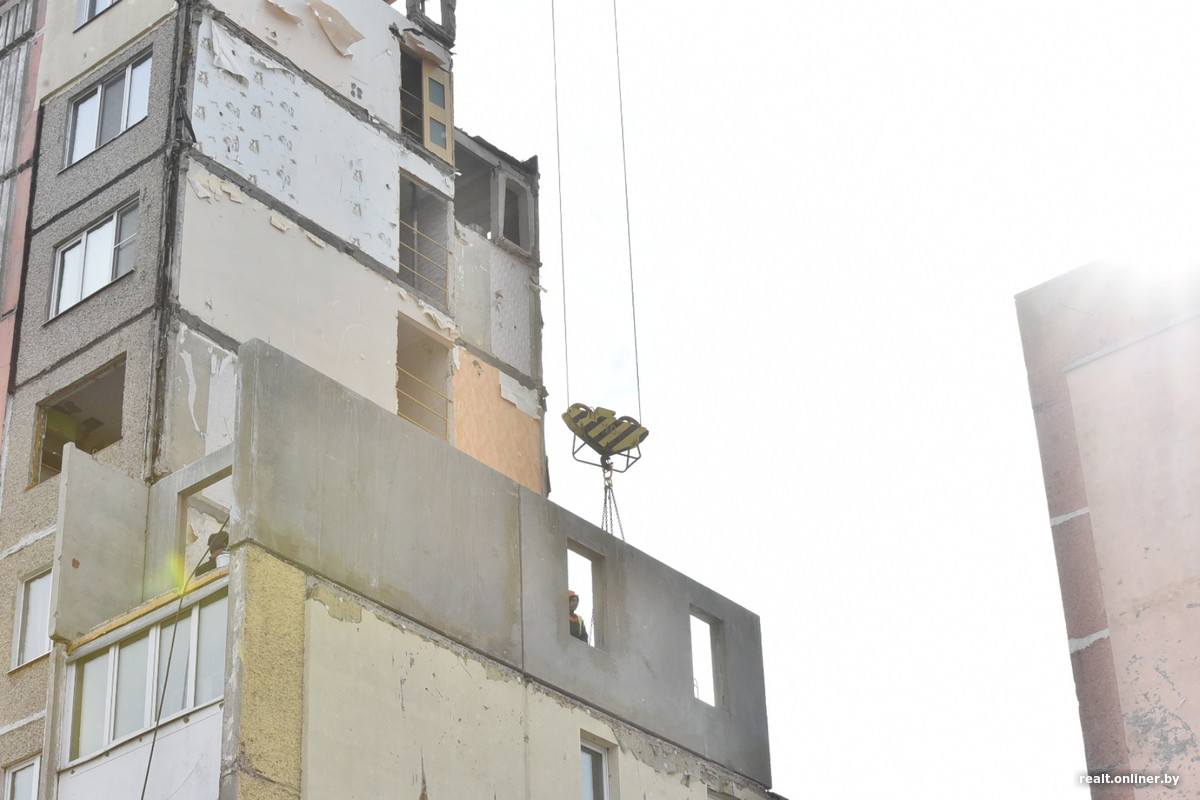 Историю одной из гомельских многоэтажек сейчас буквально поворачивают вспять. 17 декабря на ее седьмом этаже прогремел взрыв, который обрушил стены, выбил окна и сместил плиты перекрытия. Пострадавшую часть сначала разобрали по кусочкам, а теперь собирают, но уже с новыми «кусочками» — с помощью специально изготовленных панелей и перекрытий. Выглядит это интересно.