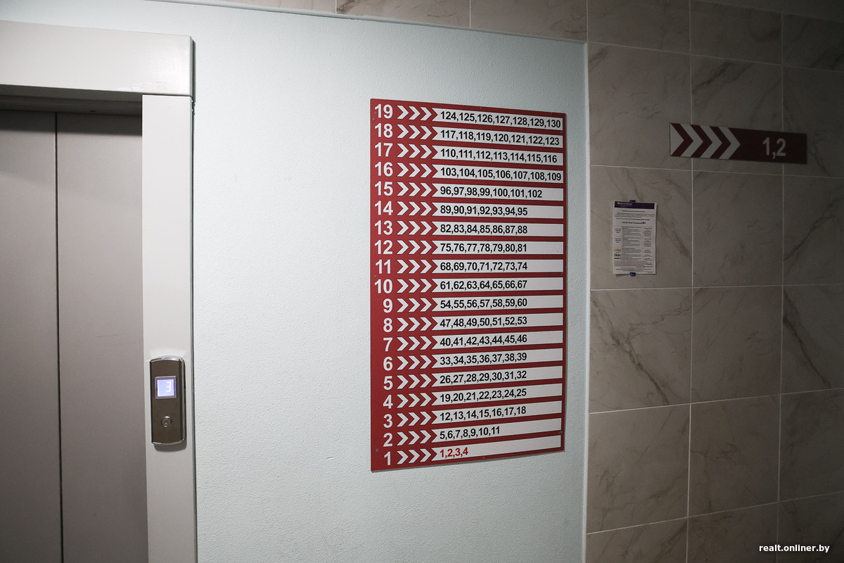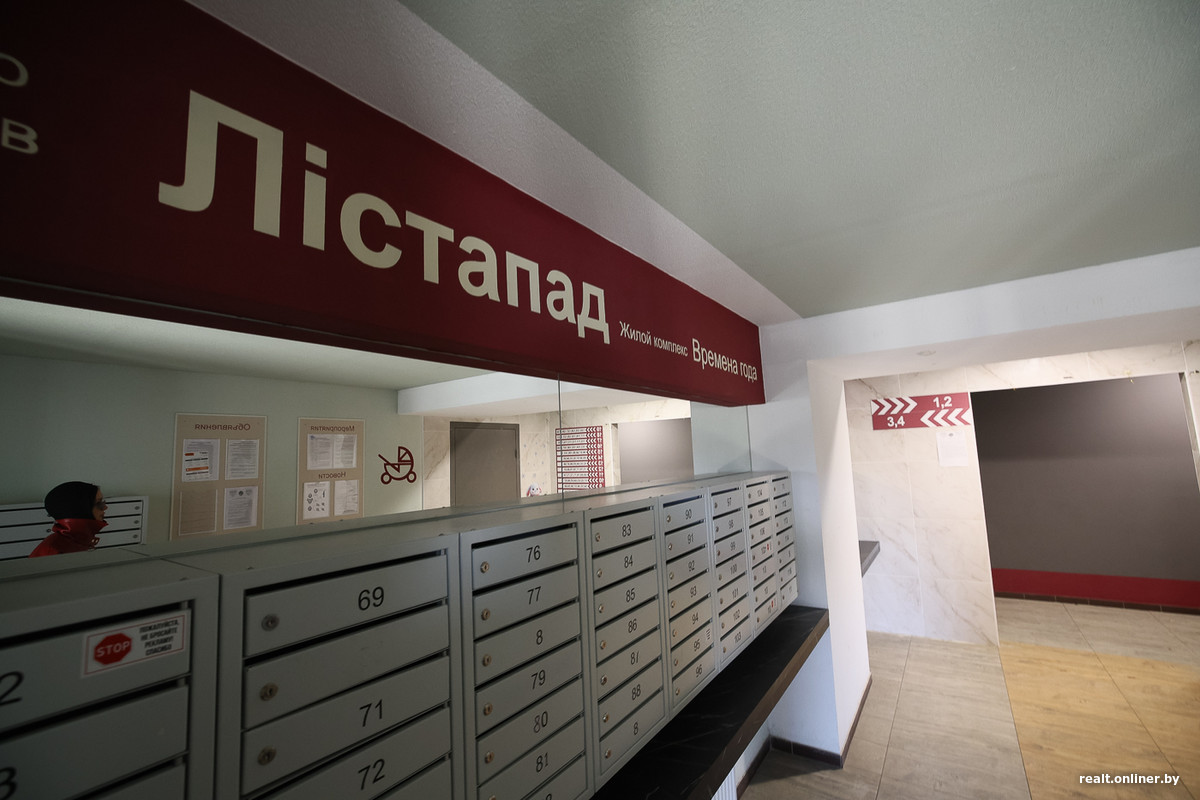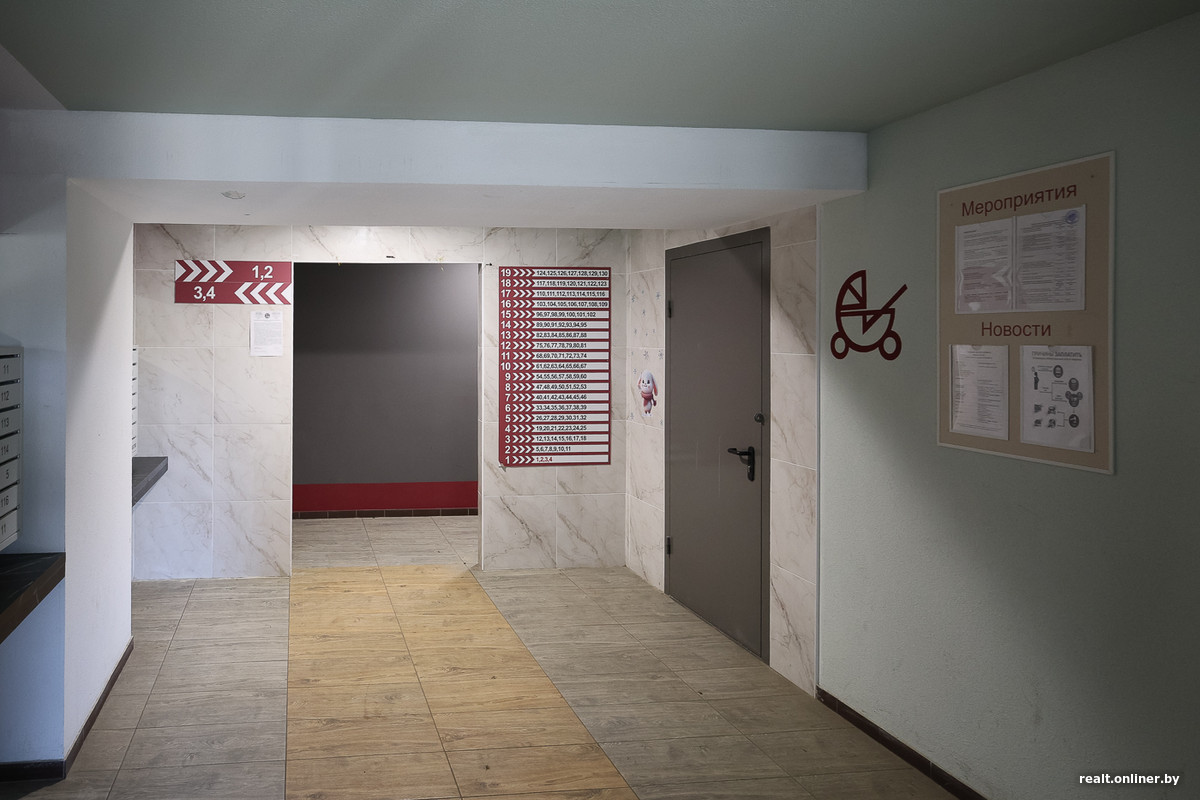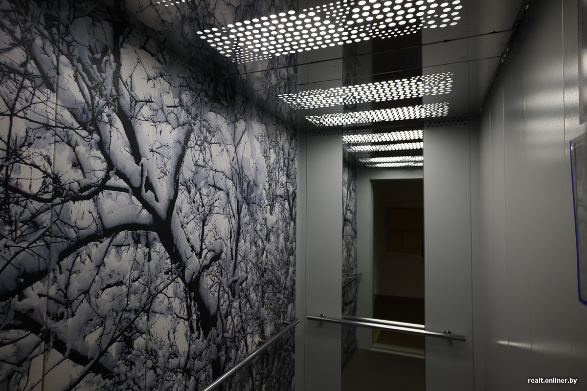 Самая главная интрига — продолжается ли сезонная тема в подъездах? И да, и нет. В каких-то домах рисунок на фасадах плавно перетекает в лифты, в других от такого декора решили отказаться. Заходим внутрь «Зимы» на Семеняко, 17, которую возвели здесь в самую последнюю очередь.