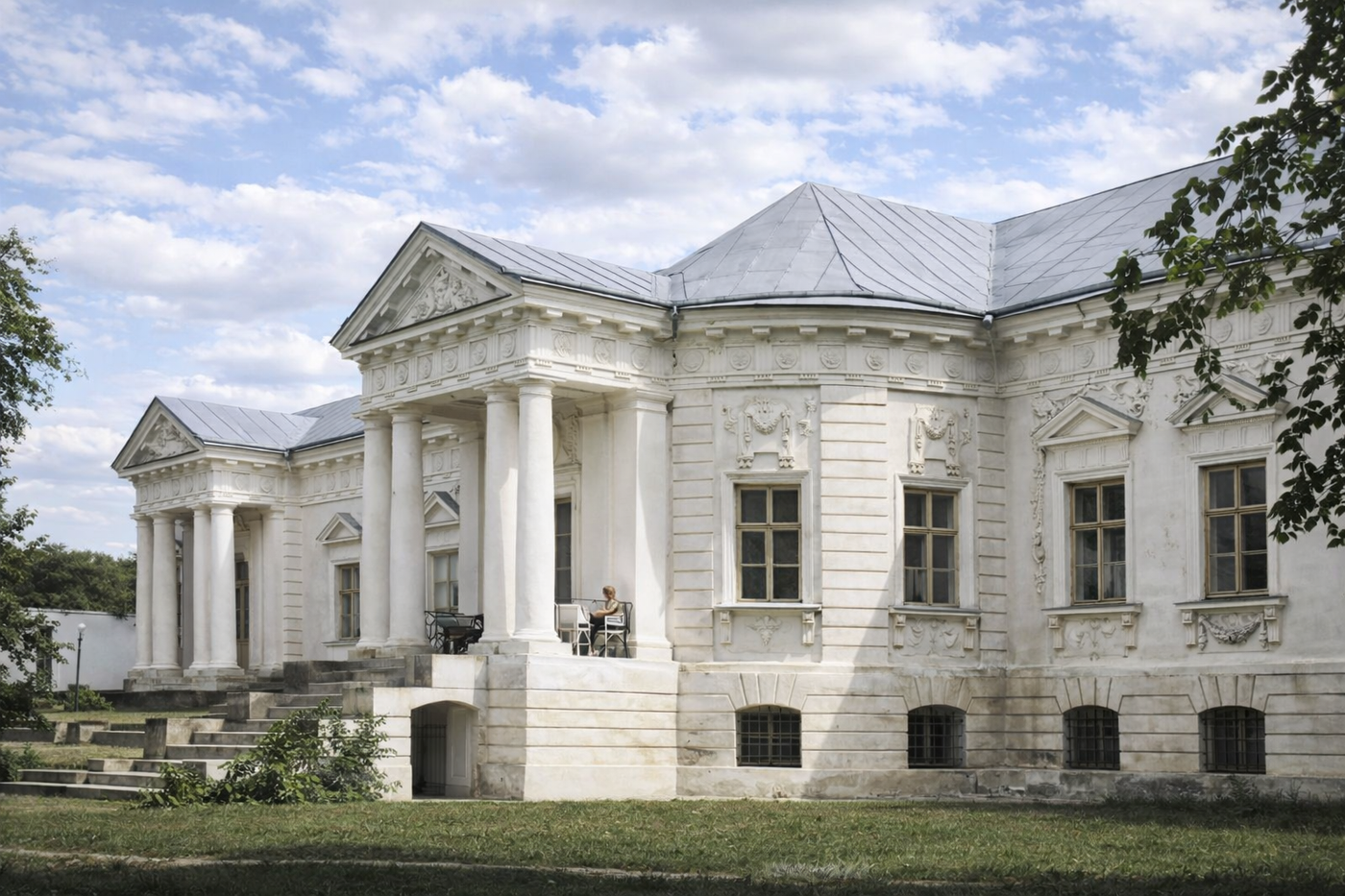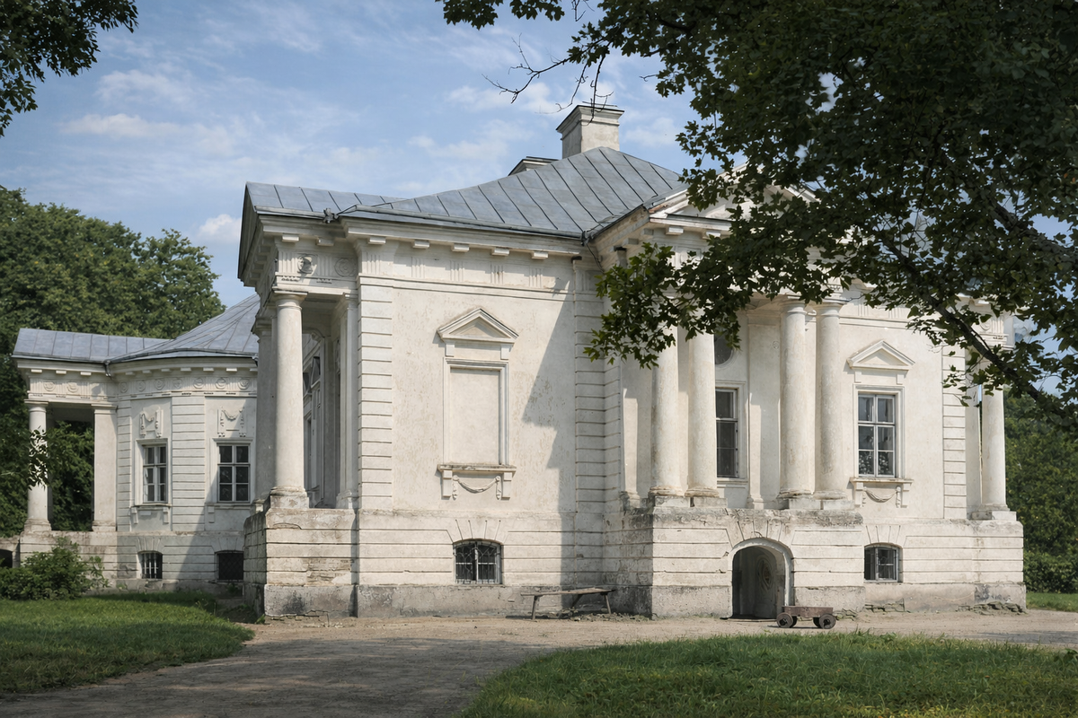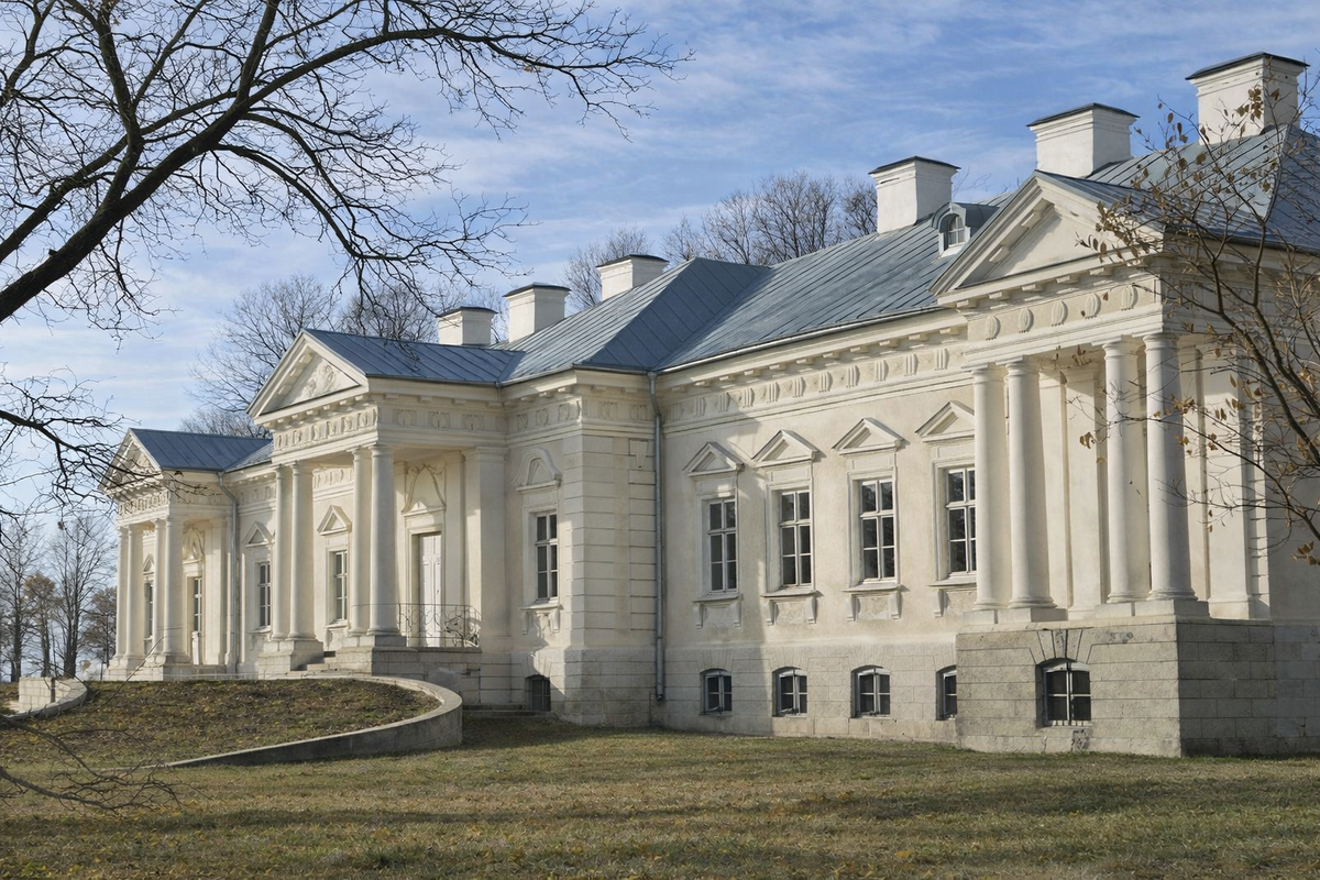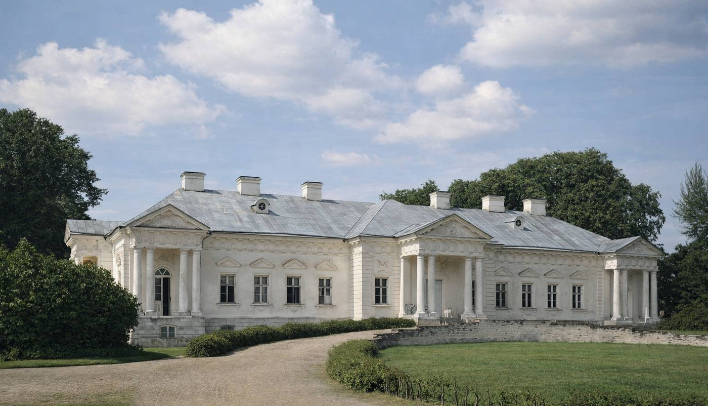 Дом выглядел аккуратно, но не поражал ни масштабом, ни архитектурой. И довольно быстро стало ясно: для амбиций Скирмунтов этого мало. Рядом закладывают новую парадную резиденцию — уже в духе строгого классицизма.