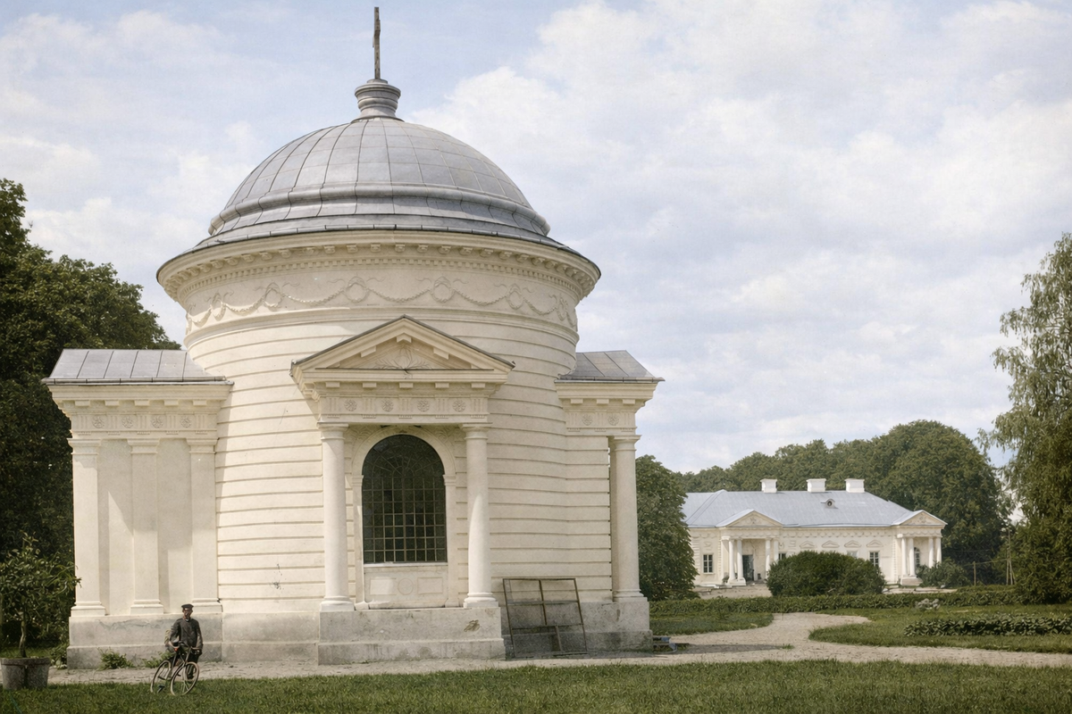 Часовня выглядела частью той же истории, что и дворец: те же пропорции колонн, тот же рисунок фриза. Она завершала усадебный ансамбль, который складывался больше ста лет.