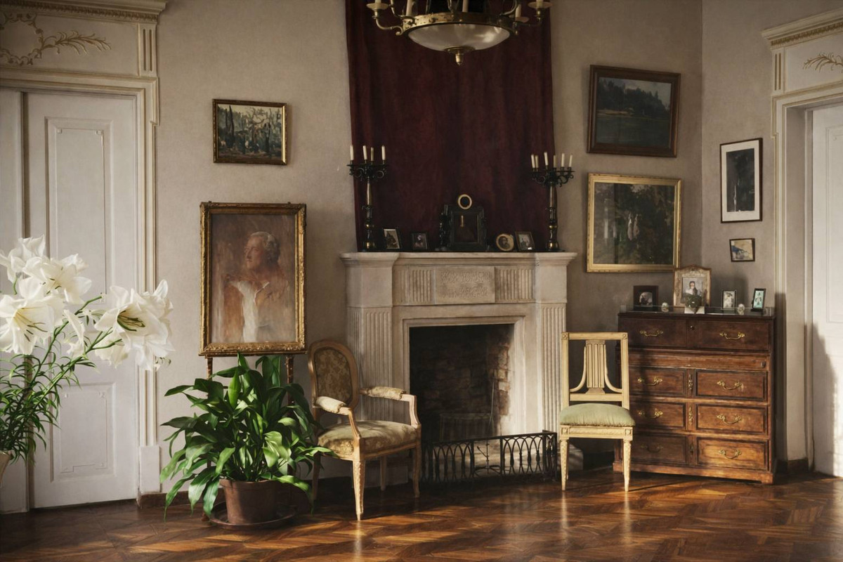 Судя по описаниям, Скирмунты любили жить красиво. В интерьерах это чувствовалось сразу: дорогая мебель в стиле Людовика XVI, картины, большая библиотека. В столовой — резной дубовый стол и гданьские буфеты, в белом салоне — легкая французская мебель.