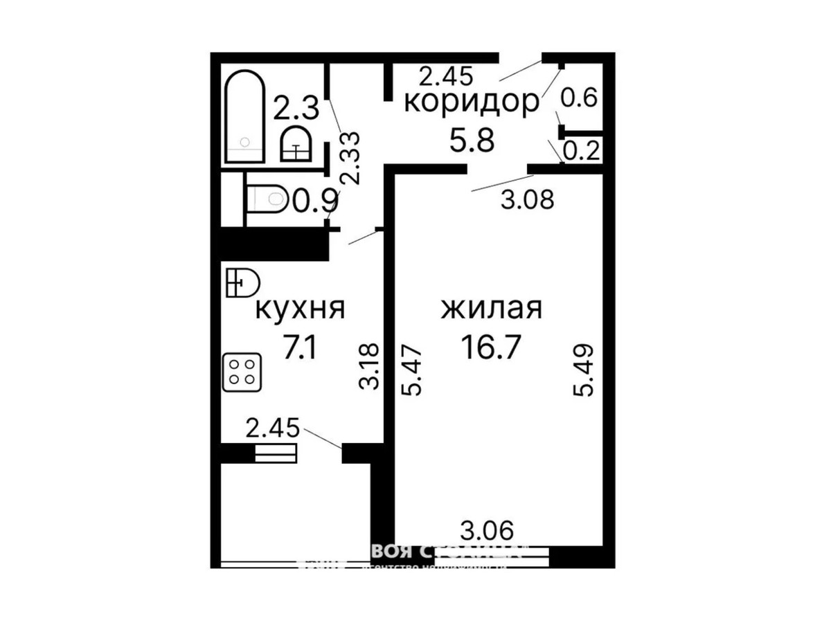Планировка здесь классическая: жилая комната на 16,7 кв. м, кухня на 7,1 кв. м (с выходом на лоджию) и раздельный санузел.