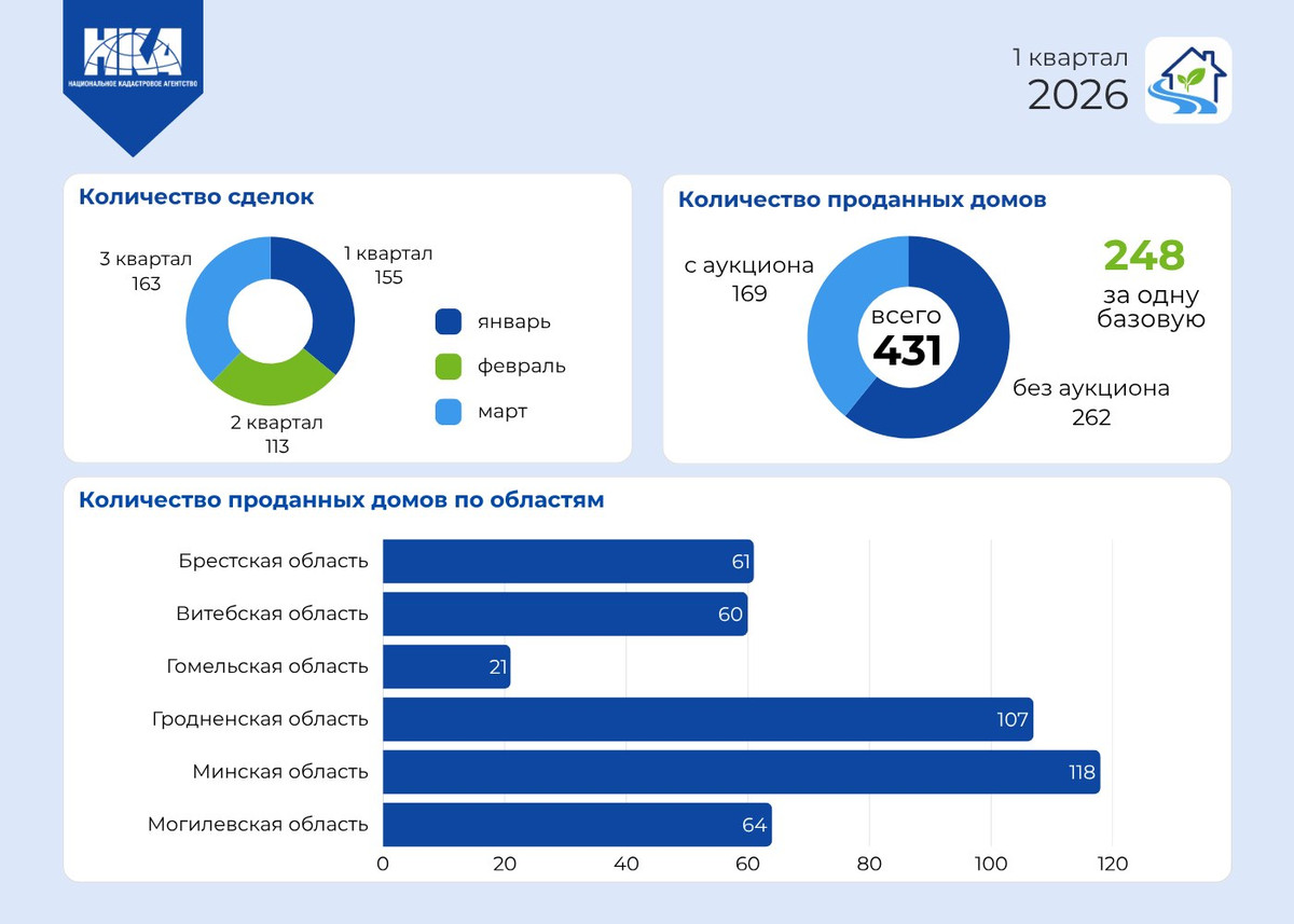 По данным НКА за первый квартал 2026 года, новых владельцев обрел 431 дом, из них 248 — за одну базовую. Активнее всего покупают в Минской области — 118 продаж. В Гродненской ушло 107 домов, в Могилевской — 64, в Брестской — 61, в Витебской — 60, в Гомельской — 21.